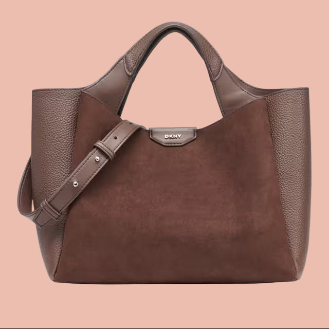 Elevate your everyday style with the sophisticated DKNY Willa Satchel, crafted in a rich blend of brown suede and smooth leather. This elegant satchel combines luxury materials with a timeless silhouette, making it the perfect statement piece for both daytime outings and refined evening looks.